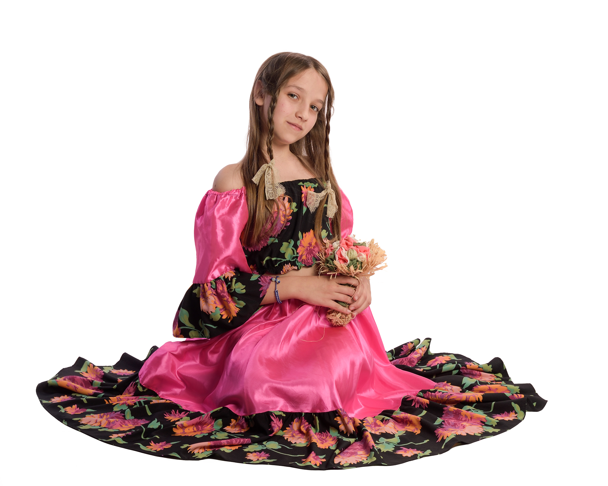 Costum tiganesc copii compus din 2 piese: fusta si top. Fusta este realizata din crep satin ciclamen si satin imprimat cu flori. Pentru alte dimensiuni si combinatii de culori, costumul poate fi realizat in trei zile lucratoare din momentul lansarii comenzii. Fotografia este cu titlu de prezentare, modelul materialului putand sa difere, deoarece multe modele sunt unicat. Pentru grupuri se ofera discounturi.