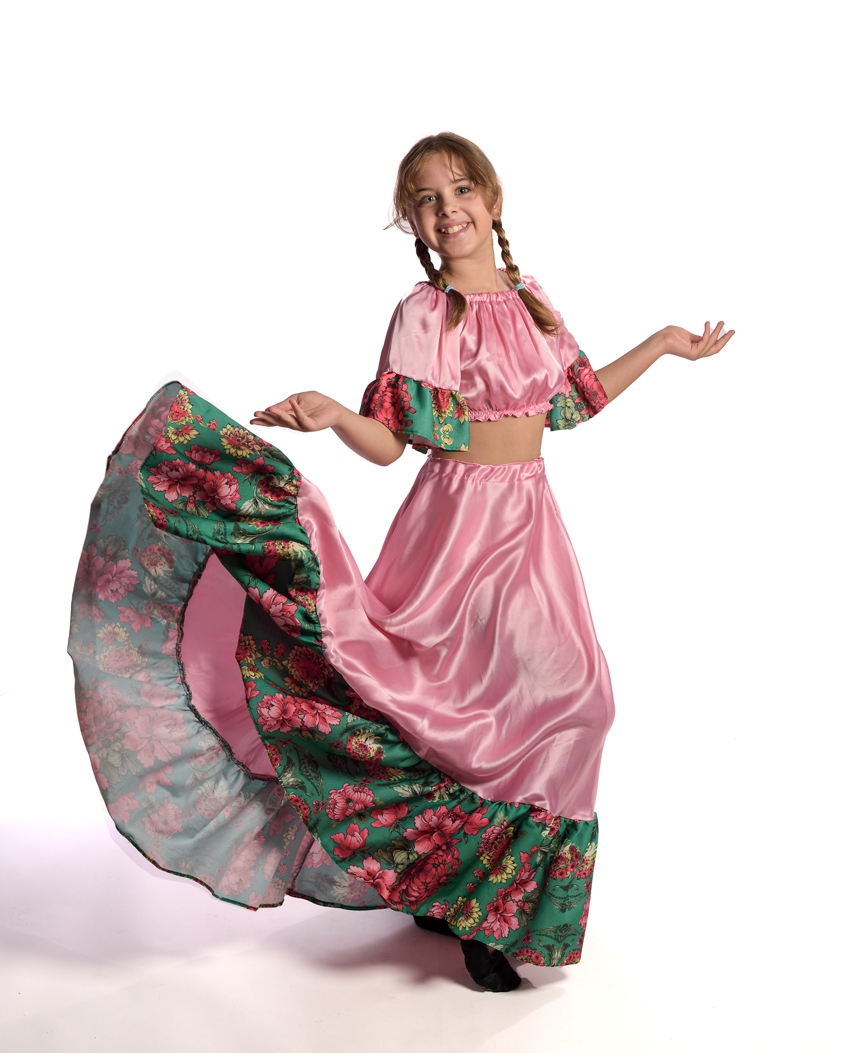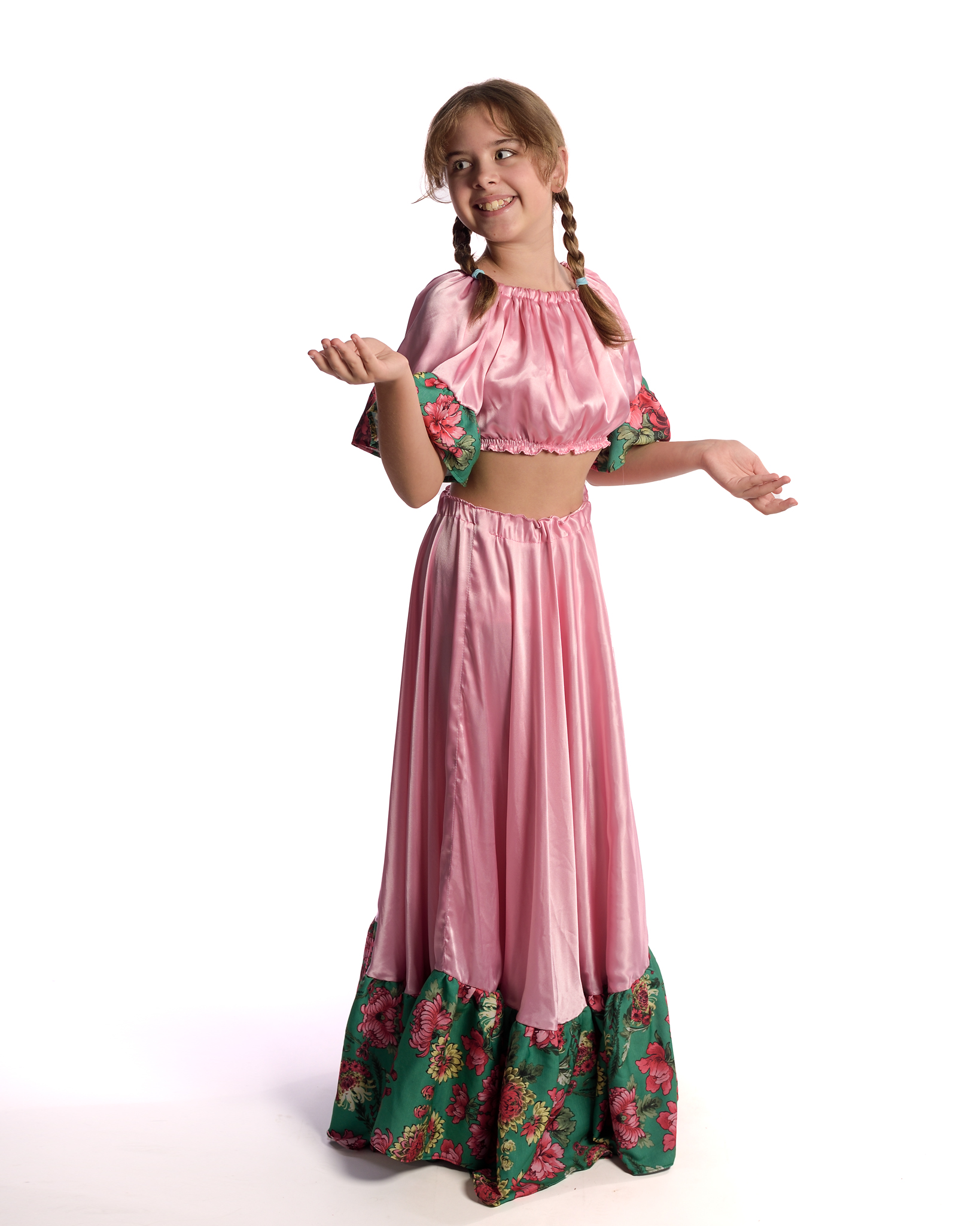 Costum tiganesc copii compus din 2 piese: fusta si top. Fusta este realizata din crep satin roz si satin imprimat cu flori. Pentru alte dimensiuni si combinatii de culori, costumul poate fi realizat in trei zile lucratoare din momentul lansarii comenzii. Fotografia este cu titlu de prezentare, modelul materialului putand sa difere, deoarece multe modele sunt unicat. Pentru grupuri se ofera discounturi.