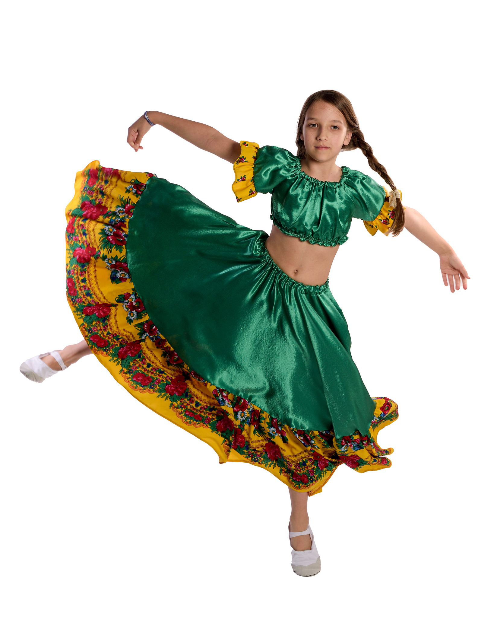 Costum tiganesc copii compus din 2 piese: fusta si top. Fusta este realizata din crep satin verde si satin imprimat cu flori. Pentru alte dimensiuni si combinatii de culori, costumul poate fi realizat in trei zile lucratoare din momentul lansarii comenzii. Fotografia este cu titlu de prezentare, modelul materialului putand sa difere, deoarece multe modele sunt unicat. Pentru grupuri se ofera discounturi.