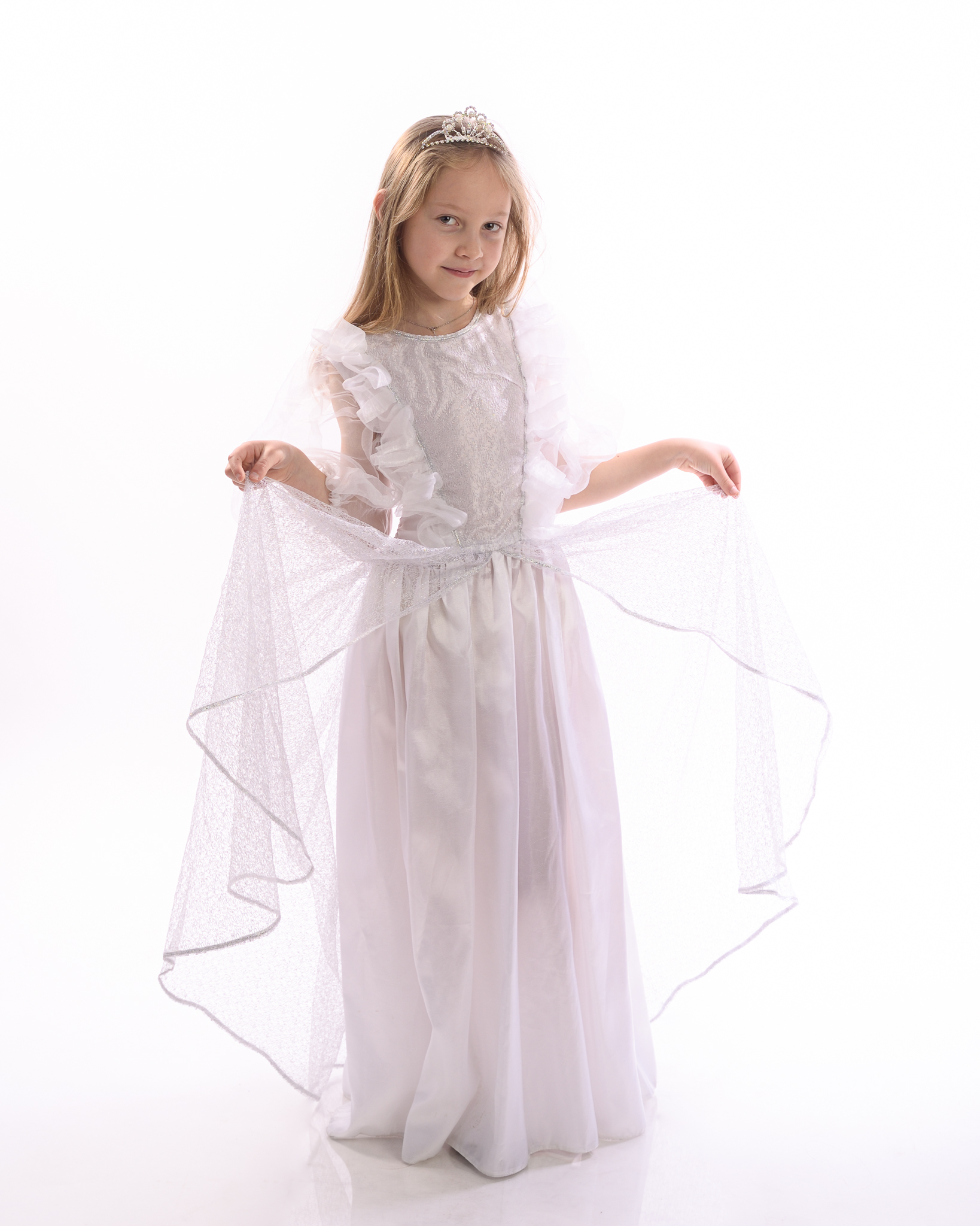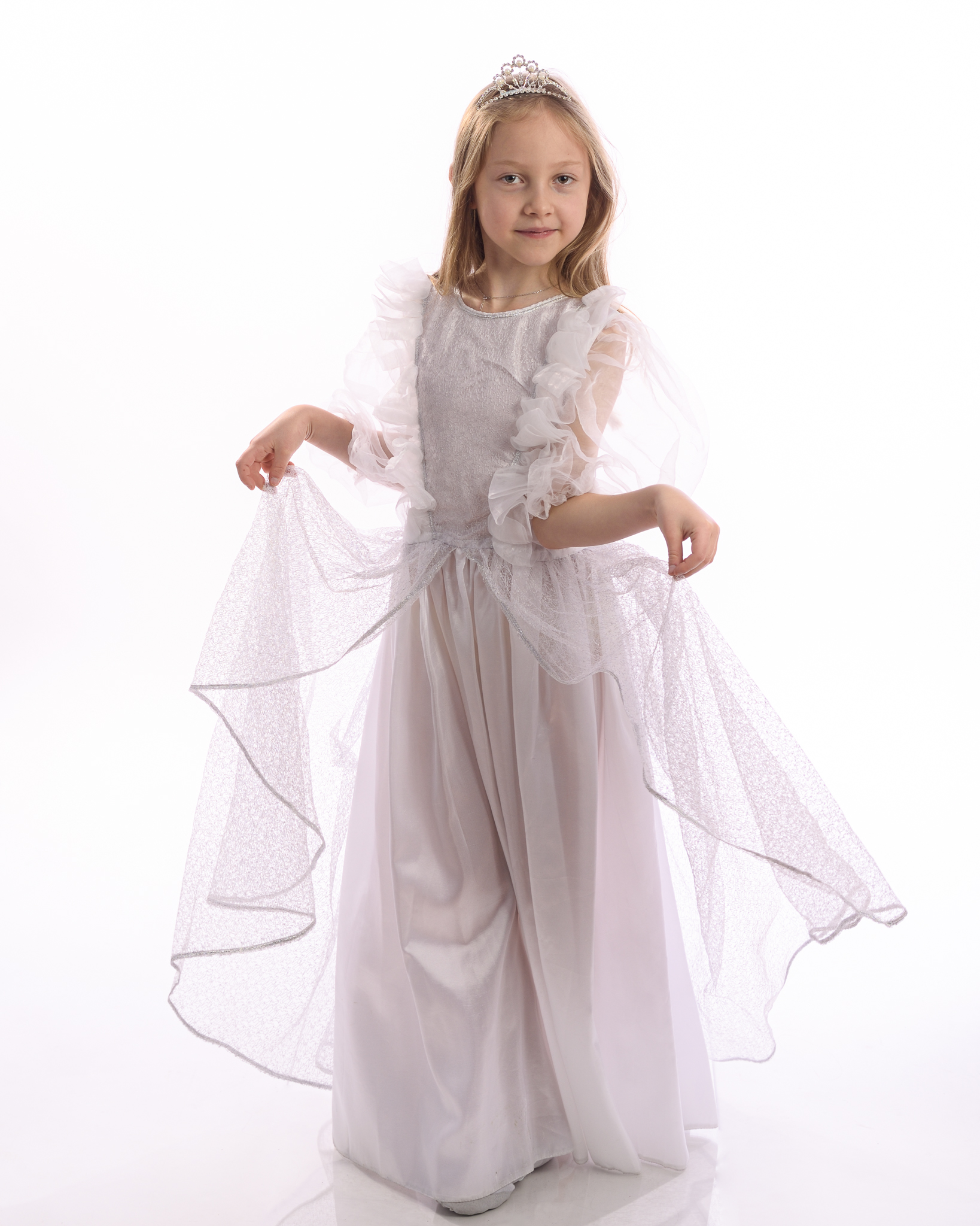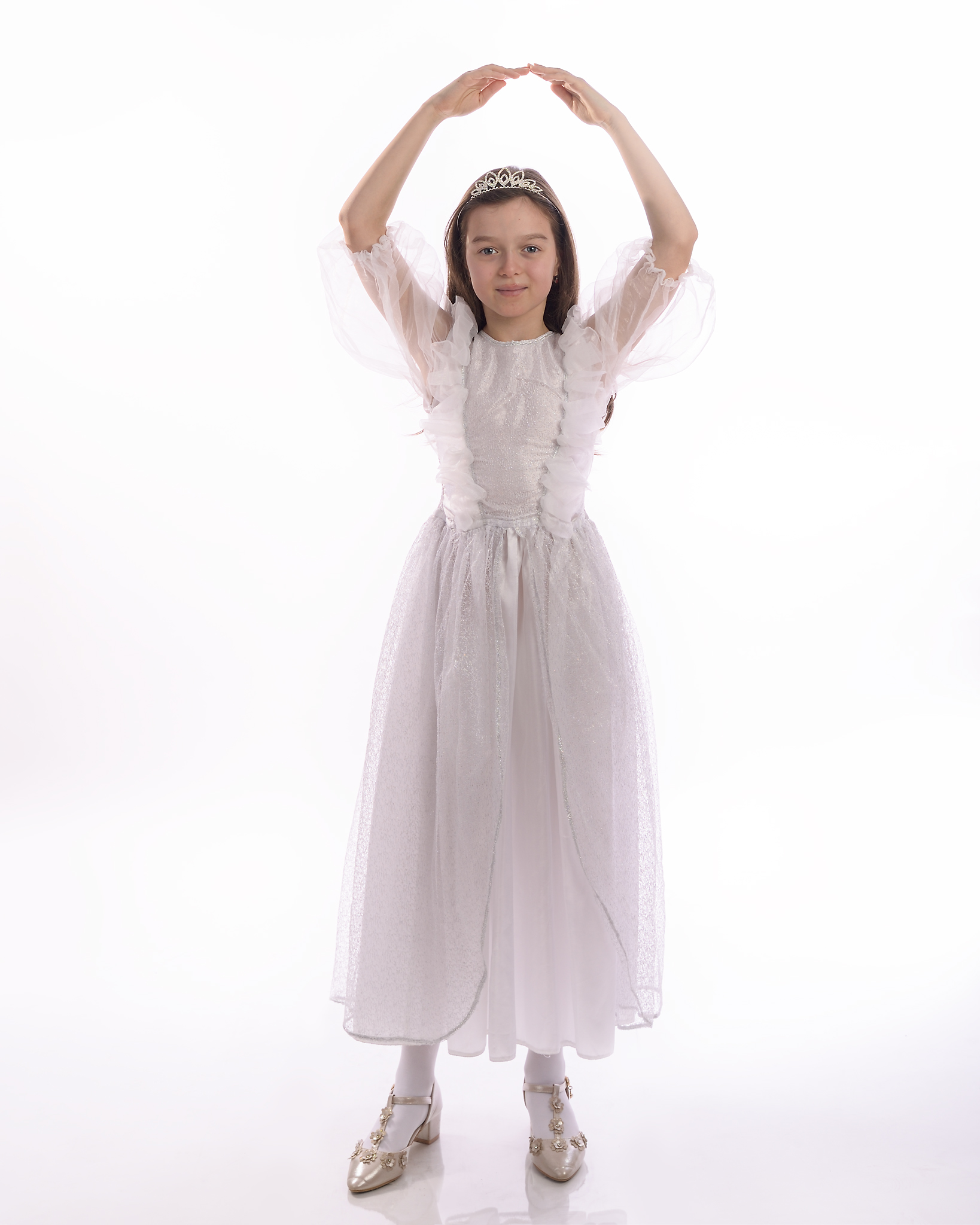 Rochie Craiasa Iarna pentru copii, realizata din crep satin alb, dantela alba, organza alba. Optional se poate comanda jupon de tull, pentru mai  mult volum.  Pentru alte dimensiuni si combinatii de culori, costumul poate fi realizat in trei zile lucratoare din momentul lansarii comenzii. Pentru grupuri se ofera discounturi.